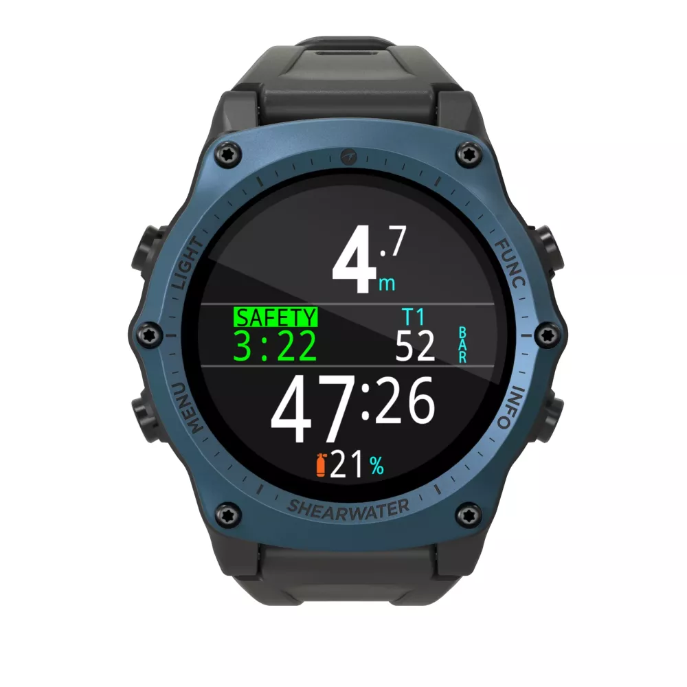 Features Vivid full color 1.39 AMOLED display Rugged stainless steel bezel and sapphire crystal Crush proof to 200m / 650ft 5 independently configurable diving modes 2 customizable layouts for every dive mode 5 customizable gases in every SCUBA mode Any combination of Oxygen, Nitrogen and Helium (Air, Nitrox,Trimix) Full decompression and CCR Support Bhlmann ZHL-16C with gradient factors No lockout for violating deco stops CNS Tracking Quick NDL and full decompression planner built in Simultaneous wireless pressure monitoring of 1 or 2 cylinders Tilt compensated digital compass with multiple display options Dedicated Freedive Mode Customizable auditory and vibration alerts High-speed depth sampling 3 watch faces available in 15 colors Bluetooth Dive log uploading to Shearwater Cloud Free firmware updates.